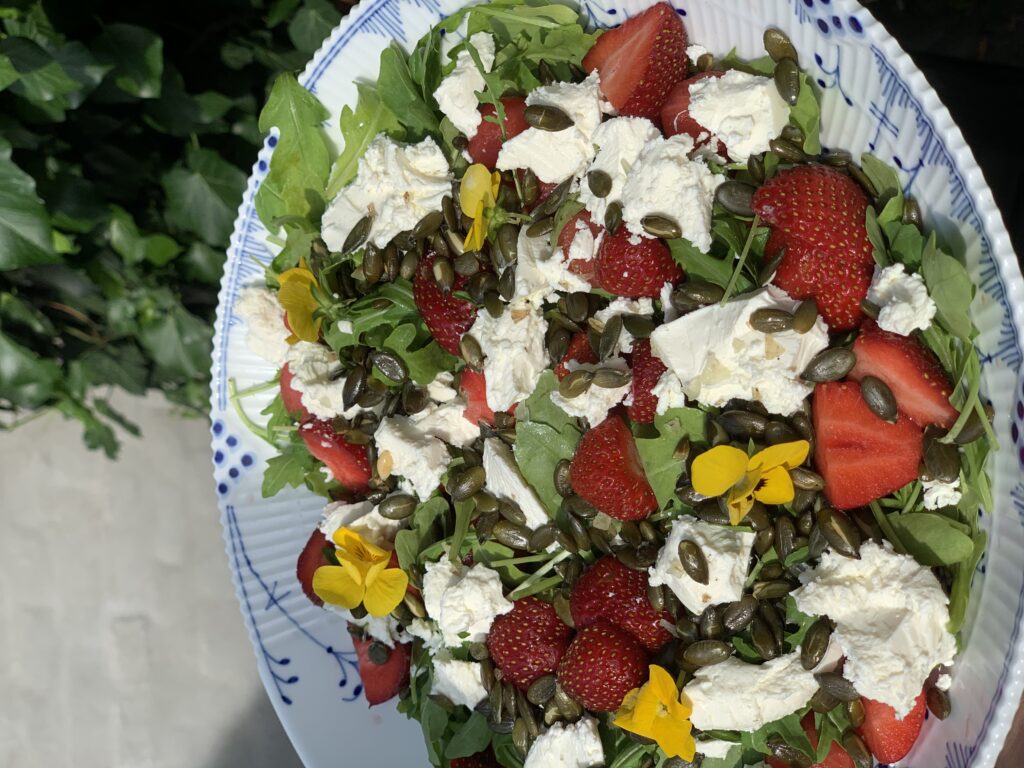 Skyl ruccola og læg den i en skålen. Udhul vandmelonen med en ske. Jeg har købt en speciel udhuler-ske, så får man fine, små kugler. Skær jordbær i halve stykker og anret dem i skålen sammen med vandmelon. Græskar- kernerne steges i olie og drysses med havsalt.